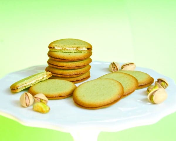 猫舌饼面团中加入了开心果酱和开心果粉,夹着白巧克力。