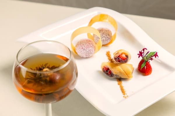搭配甜点的是以“开启”为主题的开花茶,象征着好运。当倒入热水时,花蕾状的茶叶会慢慢展开,释放出浓郁的茉莉花香,舒缓身心。这款特别的甜点是计划宾客专享,可以通过味觉、视觉和嗅觉来享受。