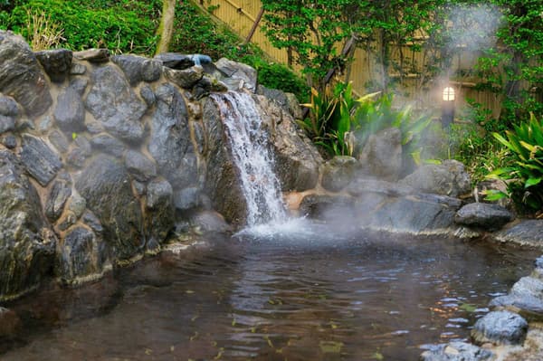 在玄海皋月温泉的岩石建造的露天温泉浴池中放松身心