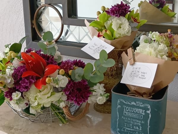 **详情:**更换酒店装饰鲜花时制作花束。客人可以随意带回家。