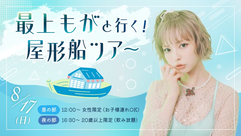 我们与艺人、模特、演员兼 YouTuber 最上もが一起举办了游船之旅!本次活动分为两个部分:白天是女子午餐,晚上是宾客可以享用豪华套餐和酒精饮品的聚会。