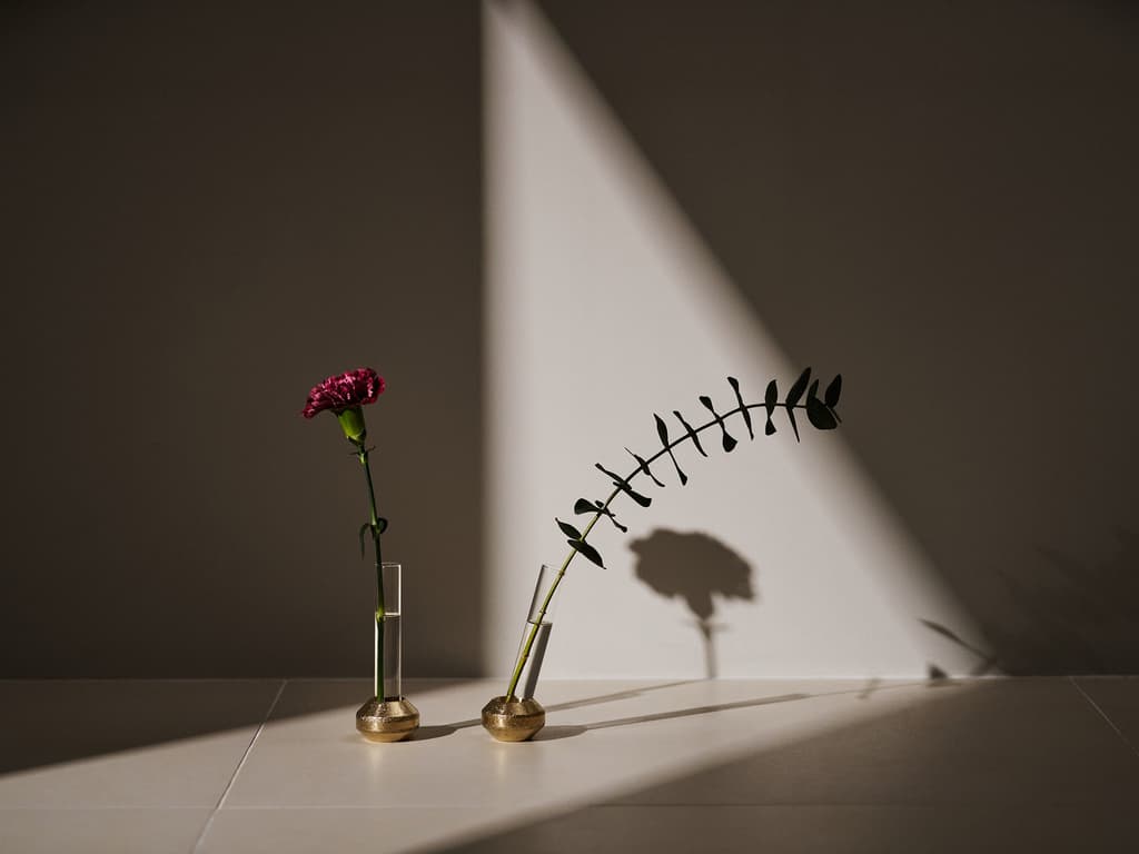 a/sym是一款将黄铜底座与玻璃管相结合的小型花瓶。当玻璃管垂直放置时,会产生对称的外观。通过将管子轻轻靠在底座上,它会转变为不对称的表达。放置方式的简单改变会产生不同的印象,让您享受各种插花方式。