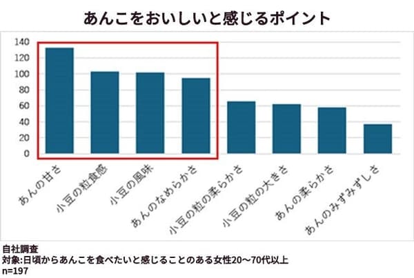 红豆馅仍然是日本各代人广泛喜爱的食材,经常在媒体和社交媒体上出现,并定期举办专门的活动。在中村屋进行的一项调查中,每月至少在超市购买一次日式点心的人中,有99.4%的人表示他们有想吃红豆馅的时候。红豆馅最受重视的品质是甜度、整颗红豆的块状质地、红豆的香气和顺滑度。受访者特别重视“恰到好处的甜度”,而人们最常想吃红豆馅的情况是“感到疲倦的时候”。