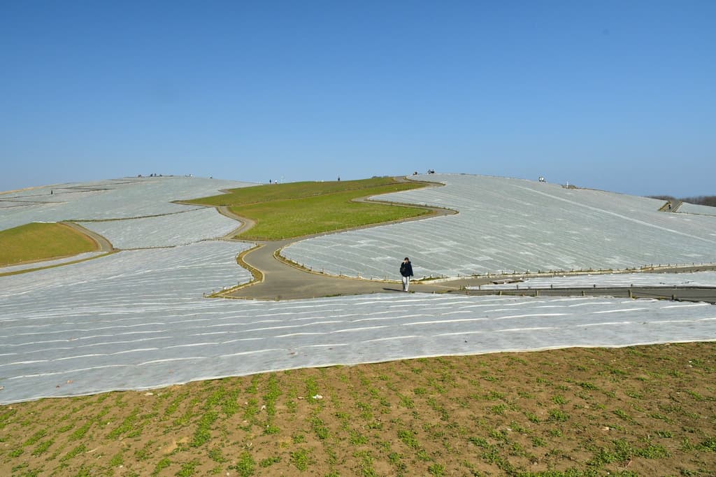 在国营常陆海滨公园的见晴之丘,2026年2月10日开始了移除防霜布的工作。目前这项工作已完成约40%,预计将于2月26日完成。这些在发芽和根部发育期间保护喜林草植物免受寒冷冬季天气影响的白色布料正在被移除,露出了下面生长的植物。这种转变标志着春天的到来,并增加了人们对山丘被蓝色覆盖的期待。