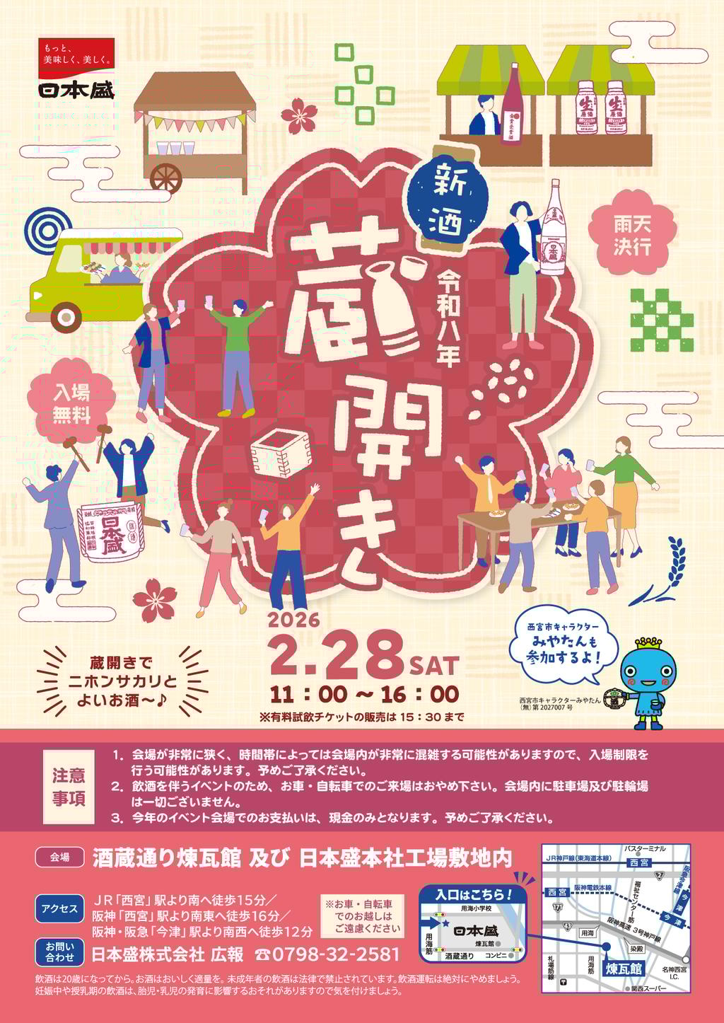 日本盛株式会社(总部:兵库县西宫市;社长:森本太郎)将于 2026 年 2 月 28 日星期六在 Nihonsakari 总公司工厂用地和 Sakagura Street Brick House 举办“日本盛新酒造 2026 年开幕”活动。这项特别活动提供了一个独特的机会,通过所有五种感官体验清酒文化,包括独家品尝、酿酒厂参观和适合家庭的活动。