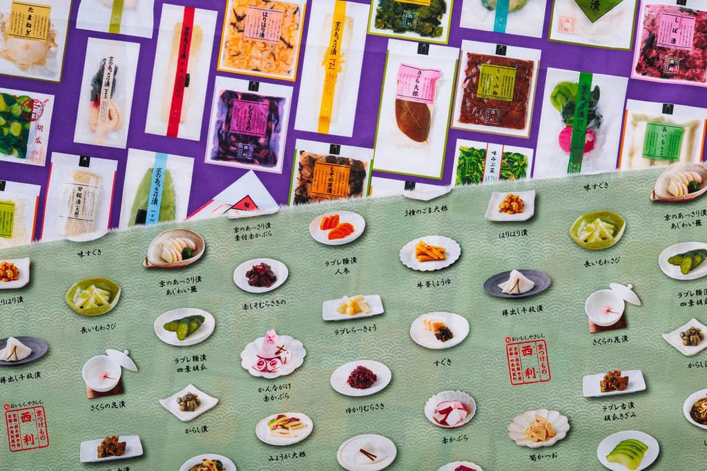 本次合作推出了两种独特的面料设计:一种以插图形式展现带有产品名称的酱菜,另一种则展示了西利的标志性包装设计。这些纺织品印在日常使用的棉布上,融合了趣味性与京都的文化底蕴,非常适合手工艺爱好者以及寻求独特京都纪念品和礼品的人士。