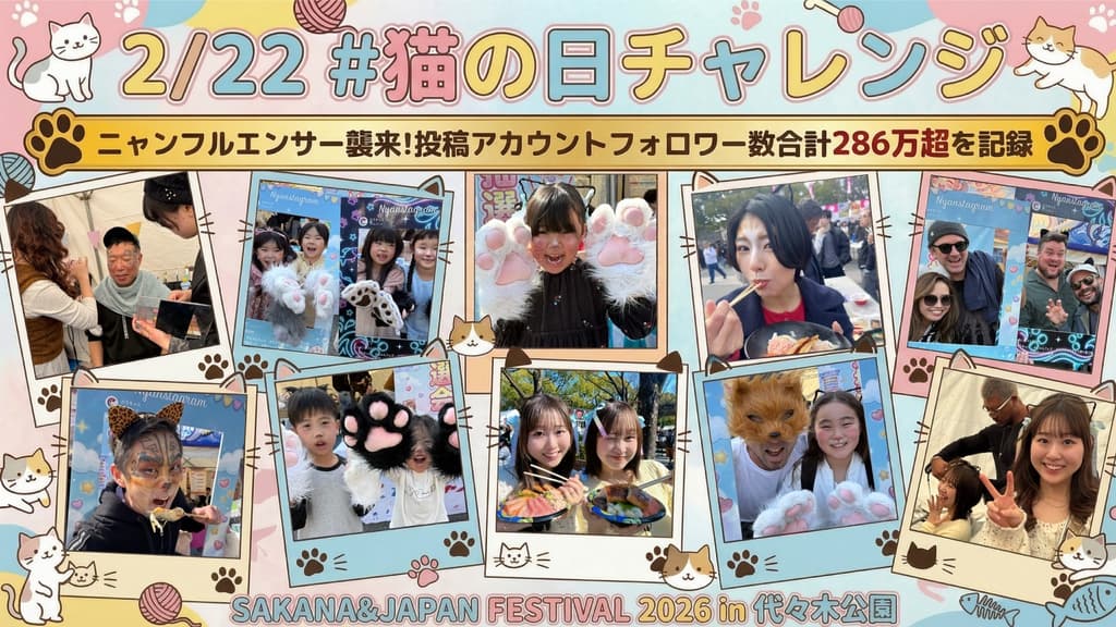 2026年2月20日至23日,东京代代木公园举办了“SAKANA & JAPAN FESTIVAL 2026”,其中一项名为“#猫之日挑战”的活动吸引了各个年龄段的游客。该活动围绕猫之日(2月22日)展开,汇集了75位名人、运动员和社交媒体网红,他们变身为“喵星人网红”——装扮成猫——鼓励游客品尝来自福岛、东北和北海道的鱼类菜肴,以此支持灾后重建。活动结束时,参与账号的粉丝总数超过286万。