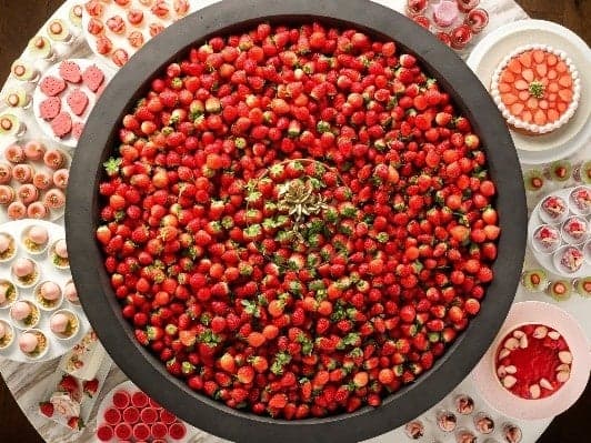 自开业以来一直很受欢迎的拍照点草莓碗,在甜点室前限时出现。直径约1米的碗里装满了三种国产草莓,包括来自神奈川县的草莓,营造出壮观的珠宝般的展示效果。此外,OZ独家套餐包括一杯含气泡酒的吐司饮品和活动开始前长达15分钟的“自助餐桌拍照时间”,让客人可以捕捉到原始的自助餐设置。