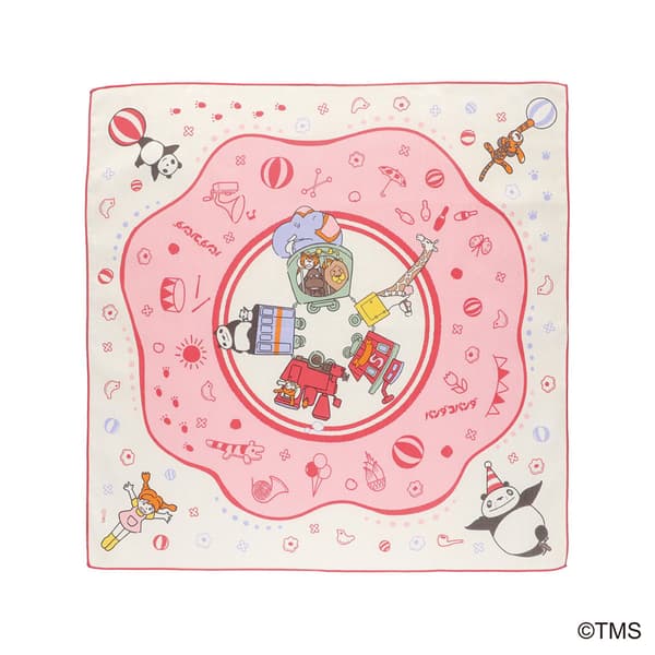 这款大手帕采用红色线锁边,温暖的色彩给人一种怀旧的感觉。设计中散布着马戏团道具和虎仔饼干的图案,而四个角则展示了咪咪、熊猫爸爸、小熊猫和虎仔表演马戏团节目的场景。中心是一个流行设计,描绘了马戏团动物乘坐火车的场景。