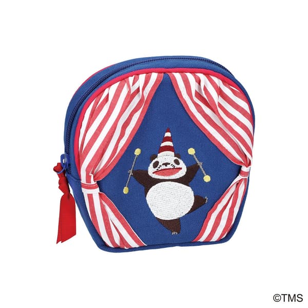 这款圆形收纳袋的设计灵感来源于马戏团帐篷。正面通过将条纹面料从左到右缝合在海军蓝底布上,表达了马戏团帐篷的意象,中心是熊猫爸爸刺绣的马戏团表演图案。背面饰有小熊猫倒立和虎仔站在尾巴上的梭织铭牌,拉链头则饰有红色丝带。