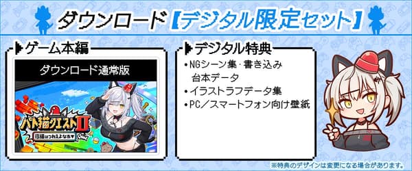 在发布日期,游戏本身将作为[标准下载版]在每个商店提供购买。此外,DLsite和BOOTH将提供[数字限定套装下载版],其中包含标准游戏以及数字奖励内容。