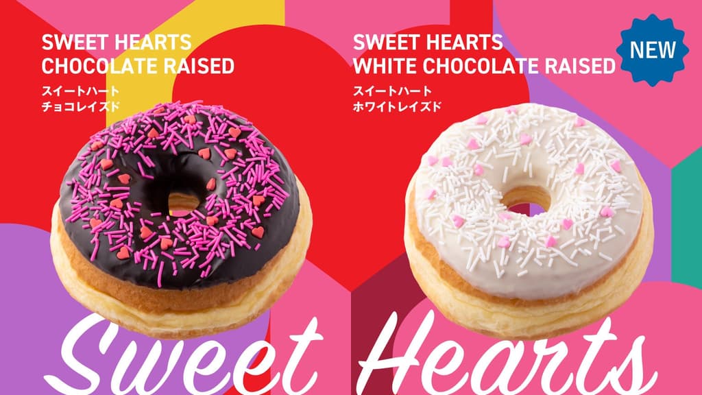 这款季节限定甜甜圈以浓郁的巧克力糖霜为特色,顶部装饰有红色心形和粉色糖屑。其色彩缤纷、可爱的外观使其成为情人节的理想礼物。