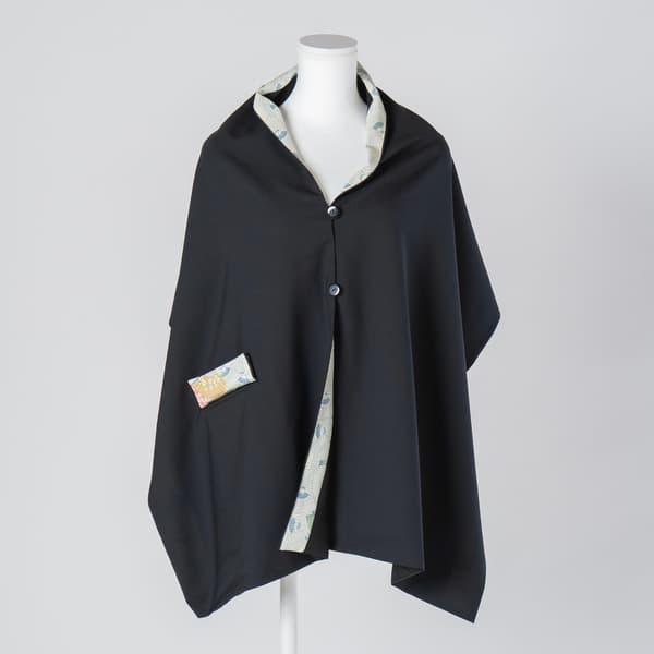 Relier81首款披肩。在基础色调的底布中织入传统染色黑色丝绸和服面料,为整体造型注入生机与活力。质地顺滑轻盈,不受季节限制,配有纽扣,可实现多样化的造型搭配。采用中性设计,无论自用还是作为礼品赠送均适宜。