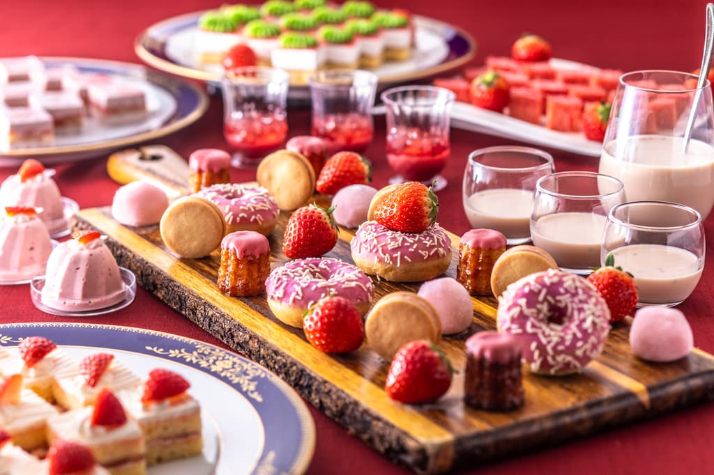 抵达时,客人将获得迎宾草莓服务——在玻璃杯中呈现新鲜草莓,为这个特别的夜晚增添甜蜜和酸爽的开始。甜点角展示了16种以草莓为中心的、视觉上吸引人的甜点,营造出充满活力和令人兴奋的氛围。