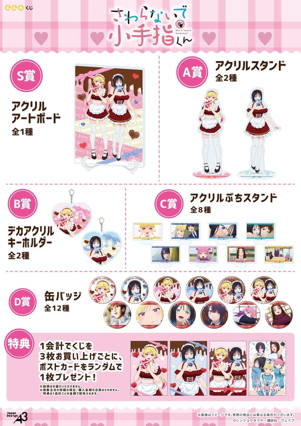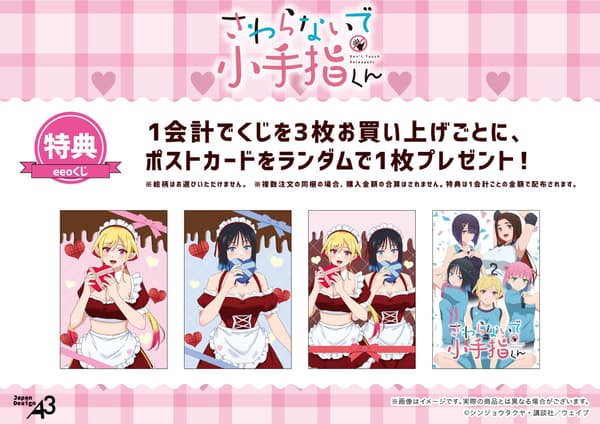 对于单笔交易中每购买3个《别碰我小手指 - Sawaranaide Kotesashi-kun》的“eeo kuji”,您将获得1张随机明信片(从4种中选择)作为购买奖励。这些是仅在此处提供的独家商品,所以尽量全部收集!