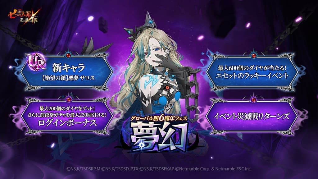 全新“全球版6周年庆典扭蛋无限”将推出新UR角色[绝望锁链]梦魇萨罗斯。里程奖励系统允许玩家每次抽取积累积分——达到900里程时,可在梦魇萨罗斯或梦魇萨布拉克之间选择,而300和600里程碑则奖励额外的UR或SSR角色。活动期间还将推出“全球版6周年庆典强化扭蛋无限”,SSR角色抽取概率提升至6%。