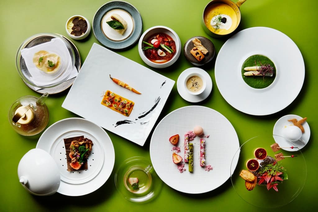 意大利饺子课程以蓝色龙虾为特色,配以柠檬香味的清汤和木芽。在鱼类课程中,鳟鱼用木兰叶熏制至柔和的中等熟度,配以核桃酱和油菜花。主菜是带骨的北海道羊肉,用萝卜和番茄慢炖;浓郁的番茄酱搭配佛卡夏面包和撒上黑松露的土豆泥。甜点是草莓慕斯,用镰仓白巧克力和开心果精心装饰,并搭配樱花冰淇淋。用餐以自制草莓茶结束,为这道菜画上温暖而芬芳的句号。