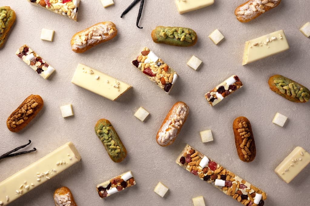 一款富含马达加斯加香草香味的白巧克力棒,层层叠叠地铺着烤杏仁、干果、蓬松的棉花糖和酥脆的饼干屑。横截面在视觉上引人注目。每一口都能带来一系列的感觉:香草的淡淡香味、白巧克力的温和甜味、杏仁的坚果味、水果的酸味、棉花糖的柔软和饼干屑的松脆。