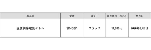 Siroca公司(位于东京千代田区)宣布推出新款“温控电水壶”,用户可以1°C为增量设置温度,并一键调用他们喜爱的温度设置。该产品将于2026年2月7日开始发售。