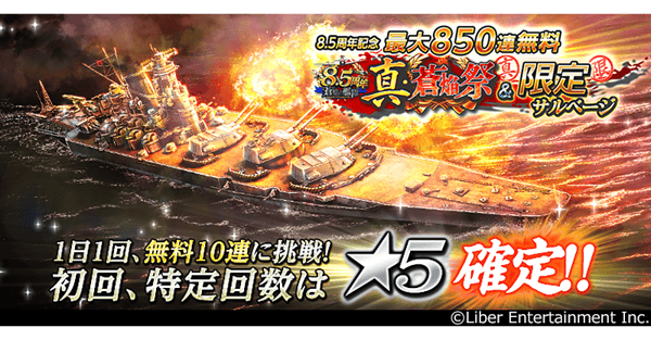 サービス開始8.5周年を記念して、特別な無料サルベージイベントが開催中です。1日1回、真・蒼炎祭の艦や期間限定艦が登場するサルベージを無料で10回引くことができます。このイベントでは、合計で最大85回のサルベージが可能で、最初の10連と特定の節目では、少なくとも★5艦が1隻確定します。