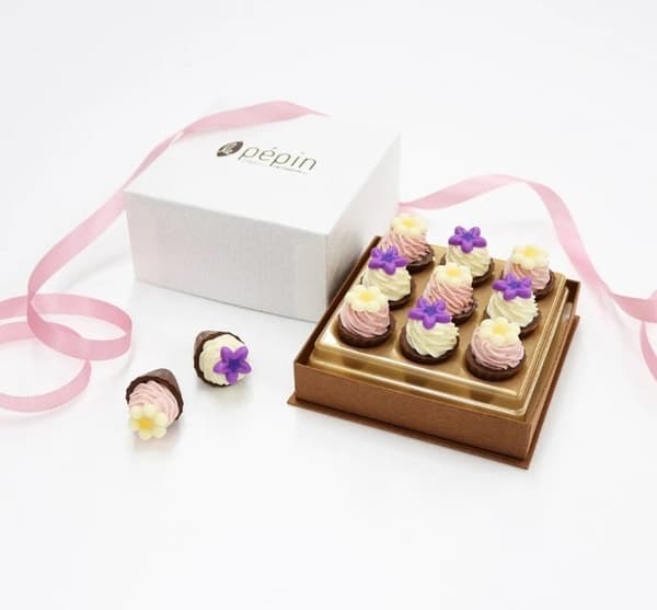 可爱的巧克力,顶部装饰着两种花朵,包裹在花坛风格的包装中。坚果和巧克力奶油的味道在你的口中蔓延。
