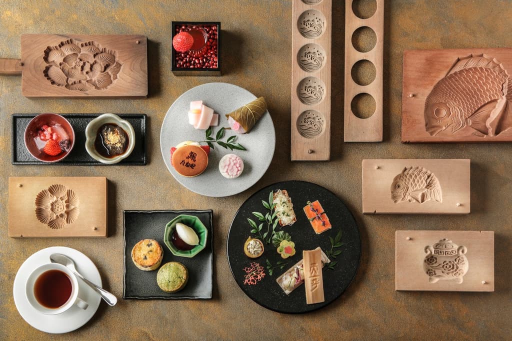 下午茶在RÉGINE二楼的特别设计环境中进行,那里陈列着传统的日本糕点模具(kashigata),营造出让人联想到传统茶道的氛围。这种周到的设计致敬了日本和西方烹饪传统中固有的工艺。