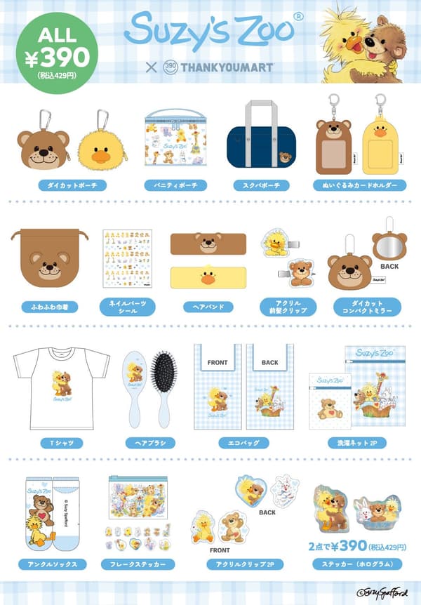 THANKYOUMART(由 Elsonic Co., Ltd. 运营)是一家以“Be Smile, Be Kawaii”为主题的商店,店内始终有 390 日元的卡通限定商品和可爱的粉丝商品出售,该店将与全球广受欢迎的卡通系列 Suzy's Zoo 合作。这些商品将于 2 月中旬起在全国 THANKYOUMART 商店陆续上架。