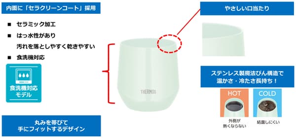 这些产品在内表面采用了膳魔师专有的陶瓷涂层“CeraClean Coat”。CeraClean Coat 具有光滑、防污的表面,易于清洁且干燥迅速。此外,不锈钢真空绝缘结构在握持热饮时可保持外壁凉爽,冷饮时可防止凝结,确保舒适使用。