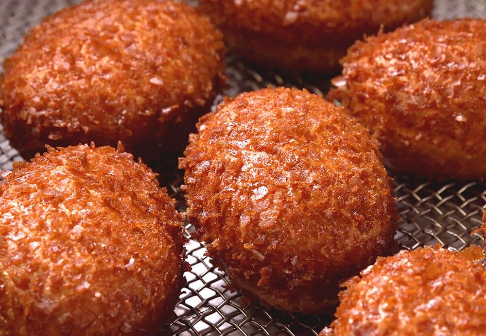 咖喱由猪肉末和牛肉混合,用炒洋葱和鲜奶油炖煮而成,然后大量加入顺滑的香蕉泥。这创造了一种完美平衡的组合,醇厚的浓郁、香甜的香气和新鲜的风味融为一体。涂层由精致的千层酥制成,赋予其非凡的酥脆香味。面包有嚼劲且蓬松。糕点店的独特美味从每一口中溢出。