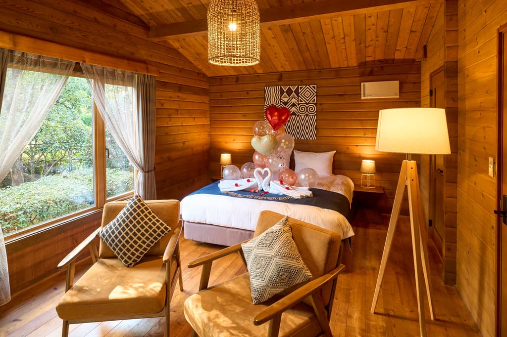 客人将入住特别装饰的客房,客房内有天鹅毛巾艺术和心形气球。您可以从三种住宿选择中选择:“帐篷小屋”,享受高级自然体验;“露台别墅”,拥有户外生活和用餐空间,享受森林的四季;或“露台别墅双人间”,配备特大号双人床。