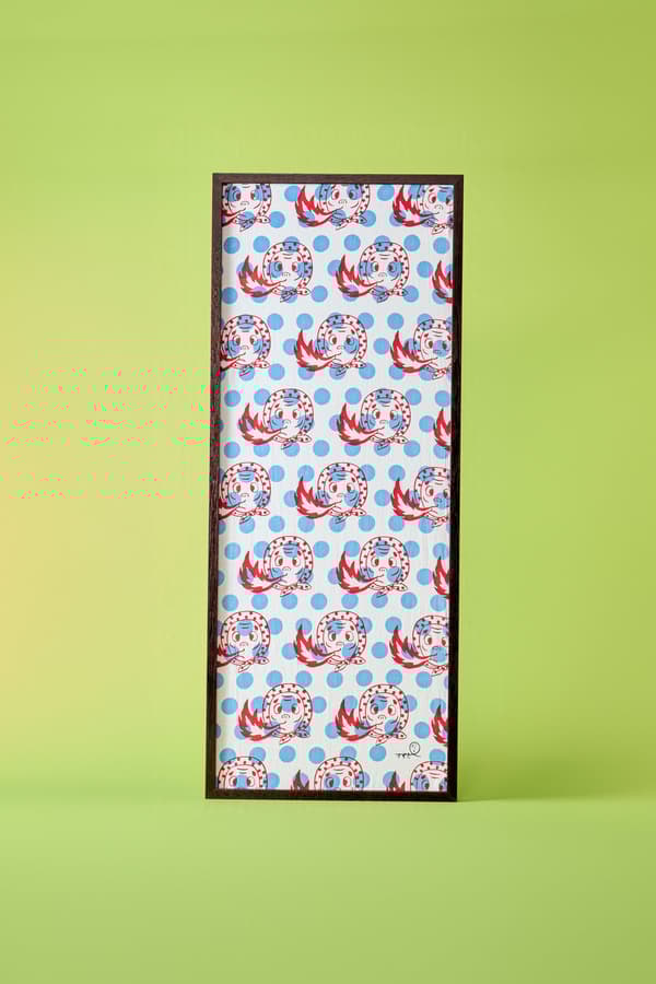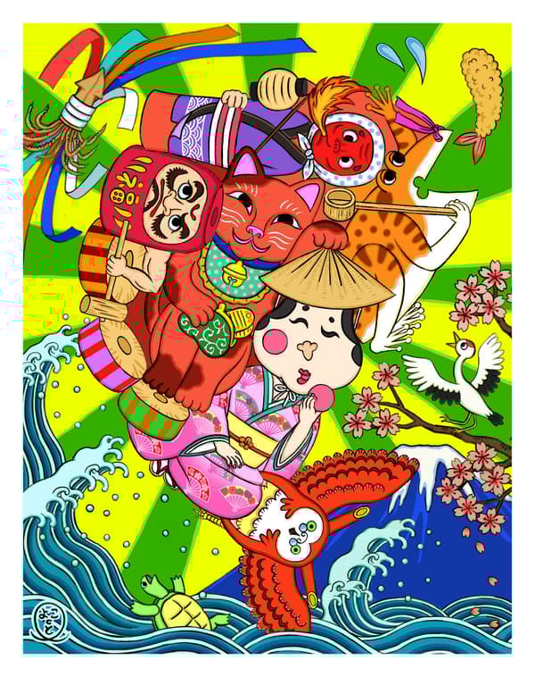 这件作品的灵感来自大渔旗,也称为福来旗,它庆祝新的开始。我描绘了幸运符和小工具一起创造巨大的财富,用鲷鱼来代表。希望在变化季节和感到有些不确定的时刻,这件作品可以成为鼓励你前进的光明存在。