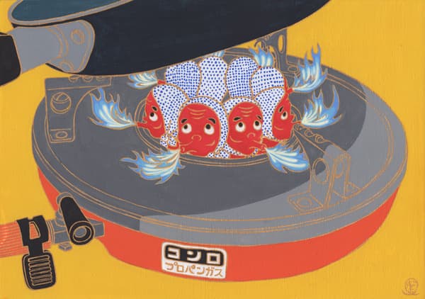 基于瓢斗子是灶神理论,并且作为我的艺术家名字具有个人意义,这件作品将瓢斗子描绘成居住在煤气炉中,作为现代等同于灶的存在。