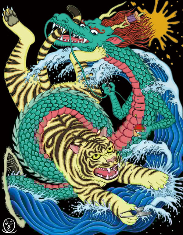 龙和虎象征着和谐,同时也代表着对立。受到服装和商品从“剪裁”和“缝纫”的对立行为中诞生的启发,我将老虎表现为日式剪刀(wabami),将龙表现为线和针。我将龙和虎描绘成守护神,当穿上它们时,会释放内心的情感,鼓励你鼓起勇气迈出下一步。
