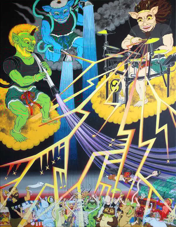 这件作品描绘了不受人类规则约束的妖怪,在音乐节上自由享受。我将像夏日天气一样无忧无虑、不可预测的能量与即使在现代社会混乱的氛围中也能享受生活的精神叠加在一起,通过风神和雷神的视角来表达。