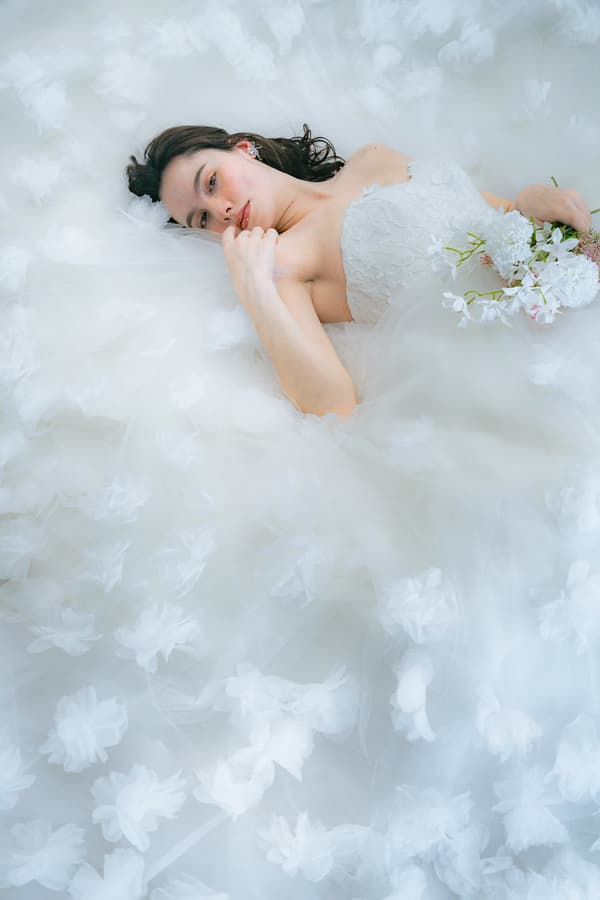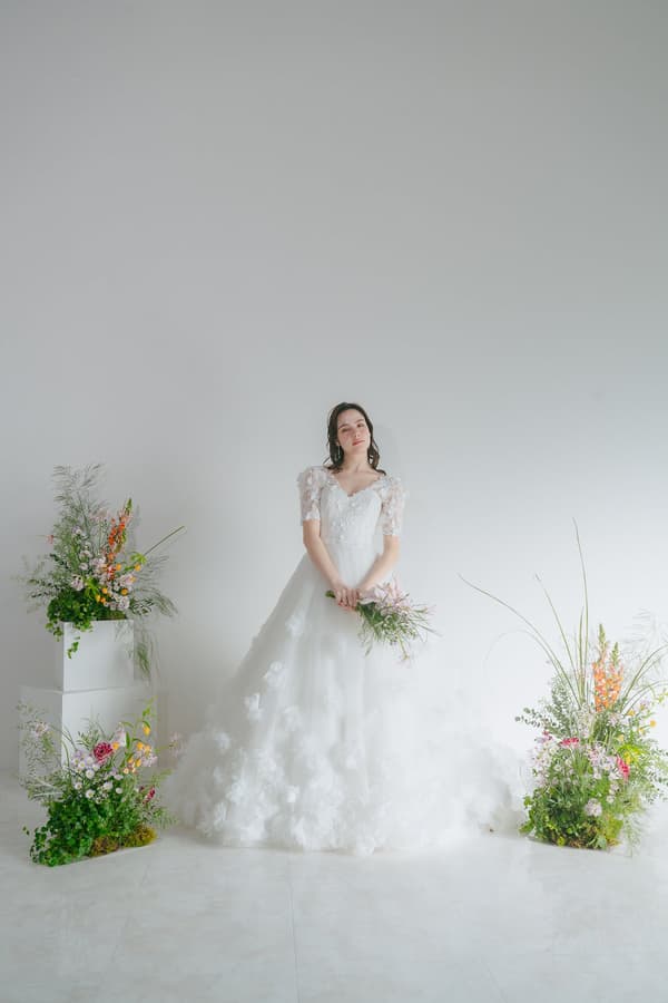 2026年コレクションのRUNWAY PREMIUMは、花柄のモチーフが全体に散りばめられた、グラマーとエレガンスのバランスが取れたAラインのドレス「Liora」です。名前は「Lux」(光)と「Flora」(花)を組み合わせています。この「欲張りなドレス」は、ハートカットのビスチェと美しく立体的な刺繍が特徴で、鮮やかに輝きます。付属のオーバースカートとヨークにより、多様なスタイリングが可能で、時代を超越したデザインとなっています。