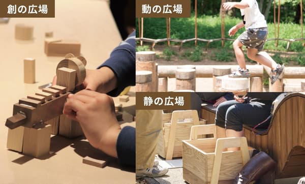 运动广场:在木制游乐设备和保健设备上活动身体,感受木材的温暖和缓冲。