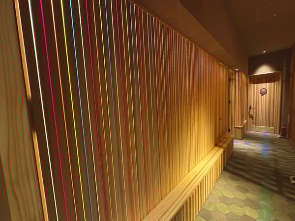 要点:展出了一种混合层压板“Kōsai-sugi”,它融合了雪松和丙烯酸,允许光线透射,同时又是木材。该面板结合了传统的木材温暖和创新技术,为室内空间带来了像“阳光穿过树木”一样的亮度,提出了前所未有的未来建筑空间。
