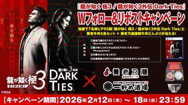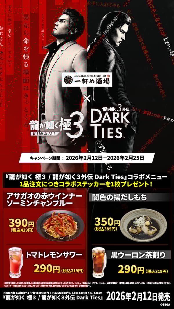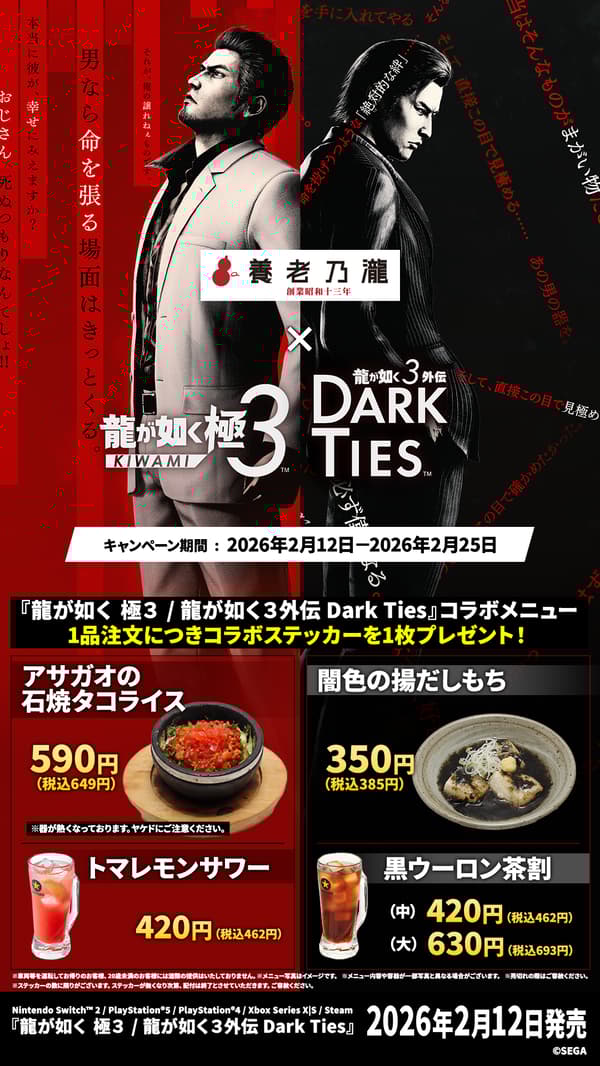 养老乃泷株式会社(总部:东京都丰岛区;总裁兼CEO:山根田俊之)将于2026年2月12日(星期四)至2月25日(星期三)在指定养老乃泷和一轩目酒场门店举办与世嘉株式会社(总部:东京都品川区;总裁兼COO:内海坤彦)今日发布的《如龙3/如龙3外传:黑暗之绊》的联动活动。养老乃泷已为本次联动准备了各种菜单,期待顾客的光临。此外,养老乃泷将在最新游戏中登场。请在现实和游戏中尽情享受养老乃泷集团餐厅的居酒屋生活。