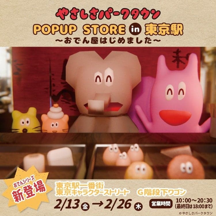2026年2月13日(周五)至2月26日(周四),以人气YouTube频道“治愈系乐园”周边商品为特色的快闪店在东京站一番街东京动漫人物街G楼梯车厢开幕。
