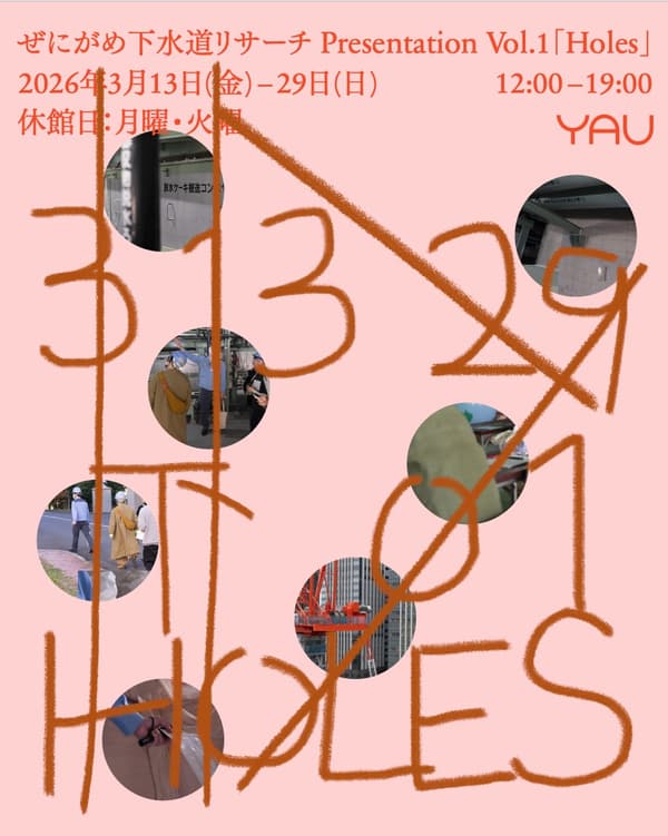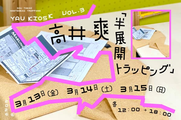 The third installment of "YAU KIOSK," a mobile program that has expanded YAU's activities into the city. Artist So Takai will move through the city with YAU KIOSK, presenting an exhibition that alternates between movement and stillness while engaging with surrounding people and events. This process, which drifts through the city, questions the boundaries between staying and moving.