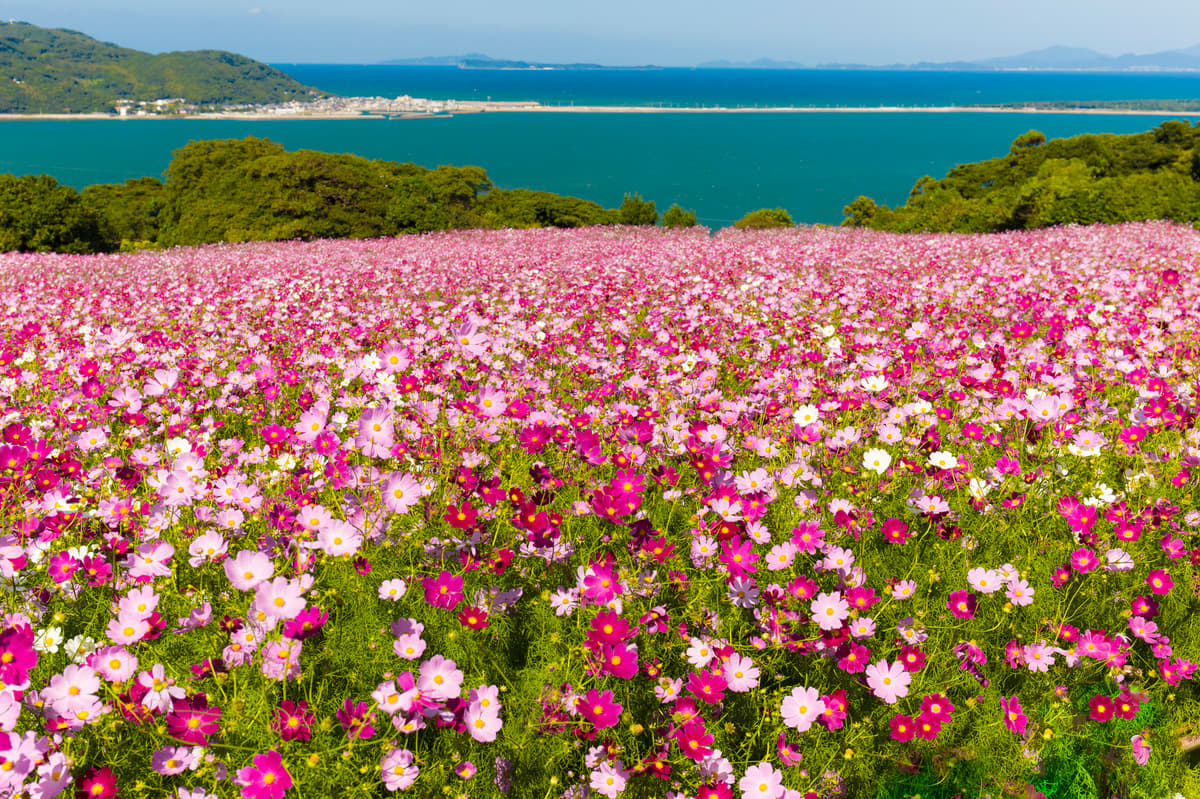 对于自然爱好者来说,能古岛是一个天堂。这个岛以其令人惊叹的季节性花卉展示而闻名,是一个充满鲜艳花朵和茂密绿色植物的天堂。从春天的樱花到秋天的波斯菊田,风景随着一年四季变化,提供无尽的拍摄令人惊叹照片的机会。