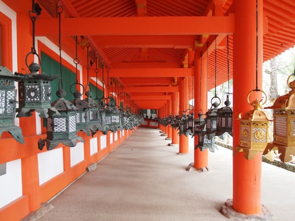 在春日大社周围的宁静森林中漫步。鲜艳的朱红色神社建筑、古老的石灯笼和悬挂的灯笼提供了令人惊叹的照片背景。