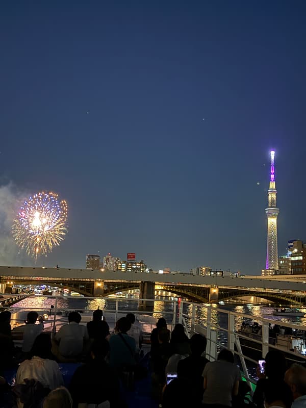 隅田川花火大会是东京最具代表性的夏季活动之一,也是日本最古老的花火大会之一,其历史可以追溯到江户时代的1733年。花火大会每年7月下旬在隅田川沿岸举行,从两个会场发射约2万发烟花,吸引近百万观众。花火大会以其烟花竞赛(Hanabi Concours)而闻名,来自日本各地的顶级烟火师在此展示他们最具创新性和艺术性的作品。