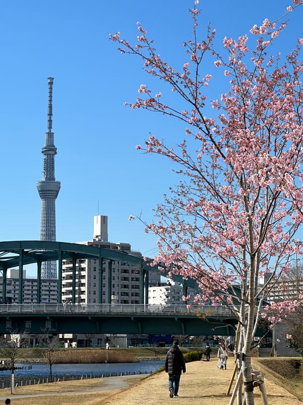 沿着隅田川河岸,您会发现令人叹为观止的观景点,在那里您可以将 634 米高的晴空塔框在浅草著名的红色雷门和浅草寺五重塔之后。在狭窄的北十间川中捕捉完美的对称倒影,尤其是在黎明时分,水面映衬着晴空塔优雅的轮廓,景色如梦如幻。