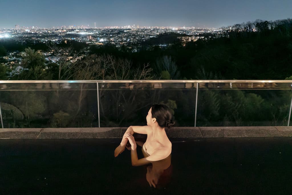 露天浴池位於海拔約100公尺處,可將東京天際線與綠意盎然的景色盡收眼底——入夜後景色更是別具一番風味。在平日的夜晚,遊客可以更優惠的價格享受夜景。
