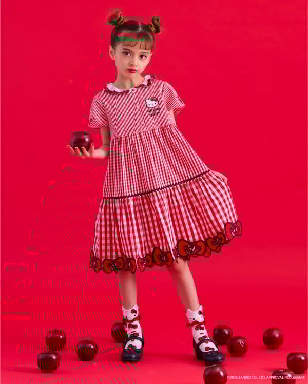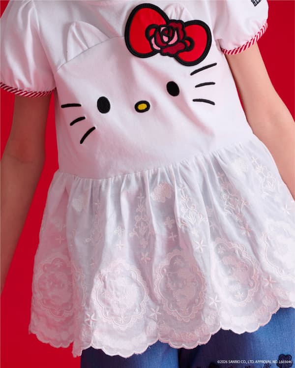 The dress in Hello Kitty's signature colors features a breezy, voluminous silhouette that is perfect for summer. Hello Kitty is appliquéd in lace at the chest, while ribbon patches adorn the hem for a detail-rich design.