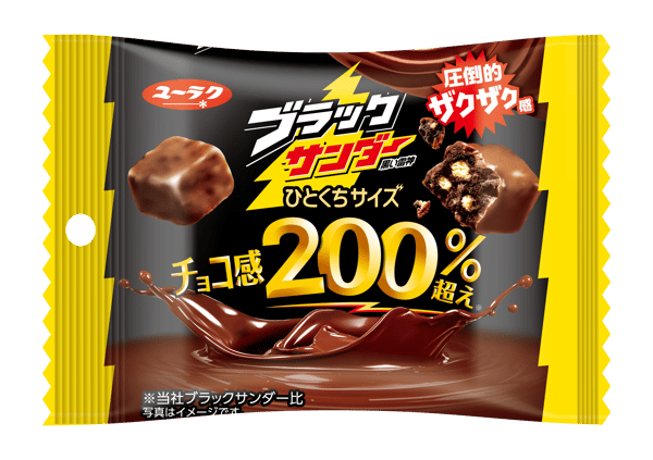 The current regular product "Black Thunder Hitokuchi Size" is marketed under the tagline "200%+ Choco Flavor" and has been praised by many customers for delivering an overwhelming sense of satisfaction in every bite.