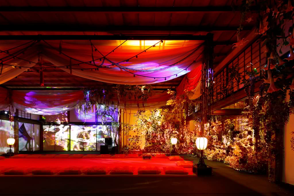 The immersive theater Hanayoi no Daichakai is a collaboration between the internationally acclaimed dance company DAZZLE and Mika Ninagawa with EiM. Over the course of approximately 70 minutes, visitors walk freely through the venue, becoming part of the story themselves. Fūgetsu-den at Kitano Tenmangu has been transformed into a space filled with color, light, music, and visuals by Mika Ninagawa with EiM. The art viewing ticket grants access not only to view and photograph the stage sets, but also to experience the accompanying music and visuals.