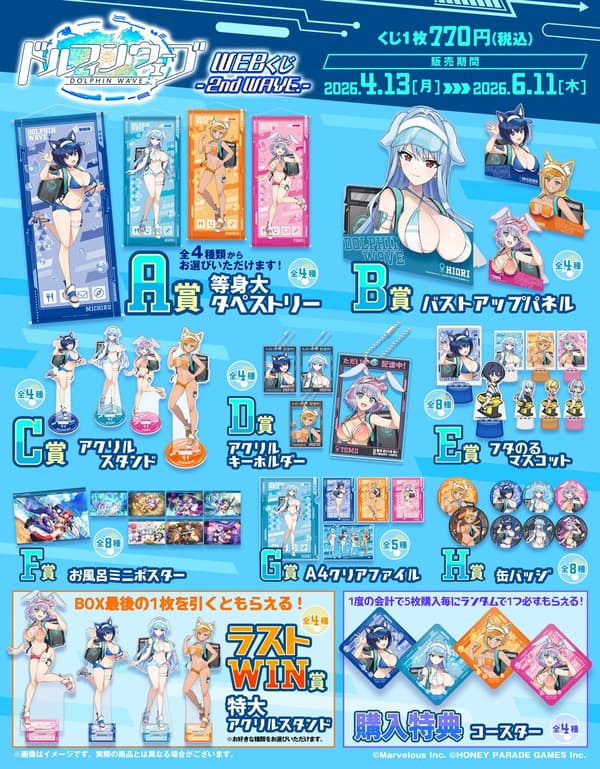 The second round of the Dolphin Wave WEB Lottery, titled Dolphin Wave WEB Lottery -2nd WAVE.-, is now on sale. This edition sees Michiru, Kōri, Mashio, and Tomo appearing in a newly drawn "Animal Ears × Delivery Staff" illustration across a lineup of goods ranging from life-size tapestries to large-format acrylic stands.