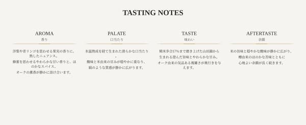 | Rice | 100% Yamada Nishiki from Hyogo Prefecture |